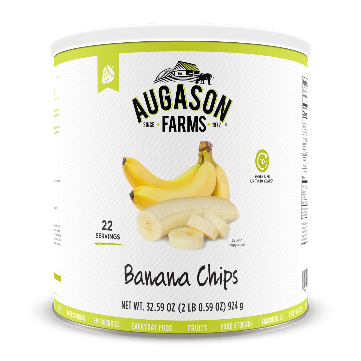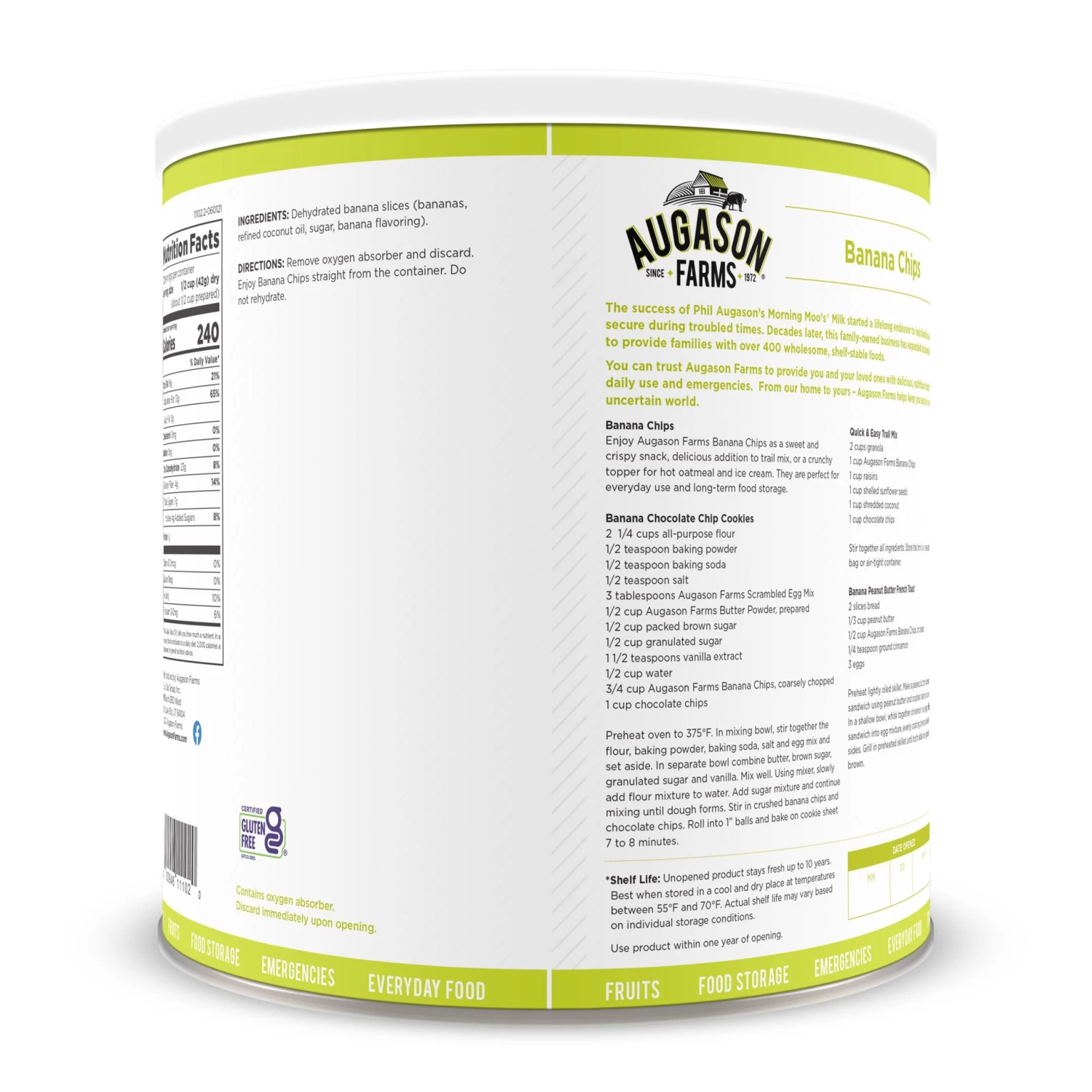 Banana Chips can be used in so many ways: as a sweet and crispy snack, in trail mix, in hot oatmeal, with ice cream, or in your favourite cookie recipe. The options are endless! Augason Farms Banana Chips are a favourite for adults and kids of all ages. They’re perfect for everyday use, long term food storage or used in your emergency food kit.