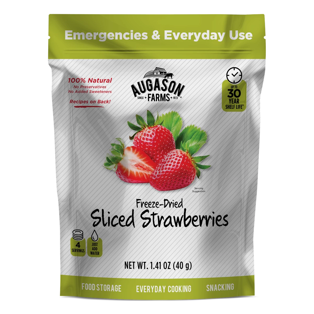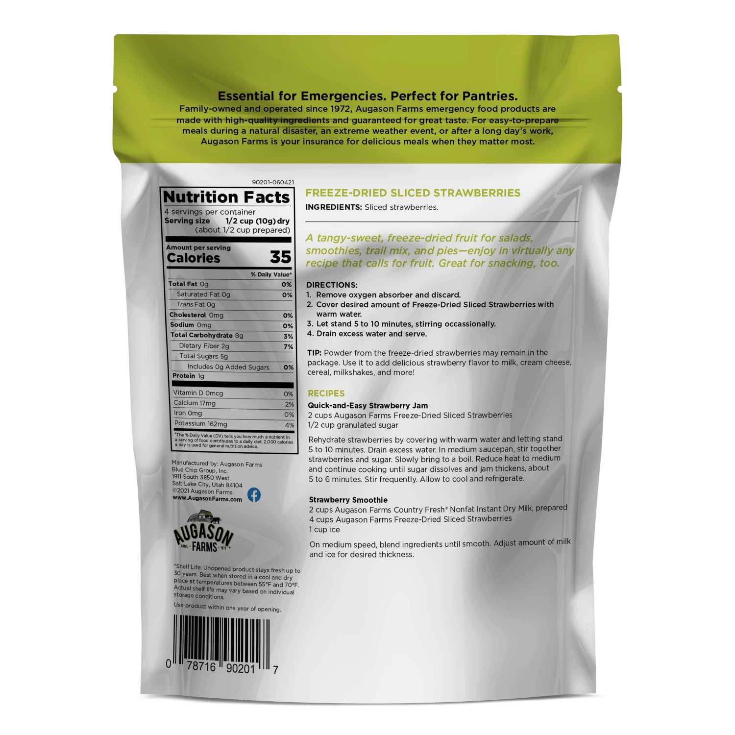 Augason Farms Freeze Dried Sliced Strawberries are packed with Vitamin C and can be enjoyed as a snack or added to your cold cereal or hot oatmeal for natural sweetness. You can also reconstitute them with a little water and use in your strawberry shortcake, strawberry milkshake, or to top off a strawberry torte.