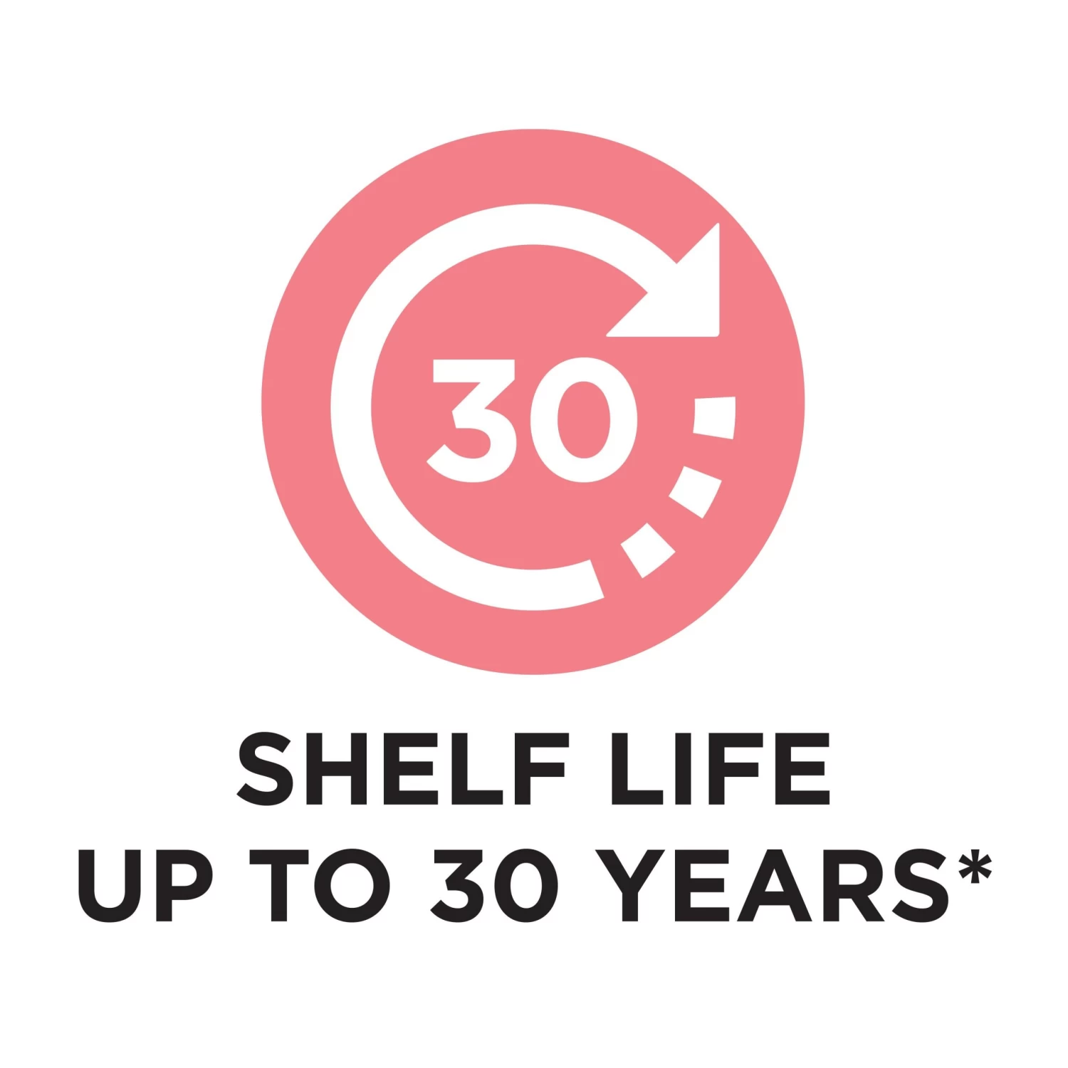*Shelf life up to 30 years. Best when stored in a cool and dry place at temperatures between 55F and 70F. Actual shelf life may vary based on individual storage conditions.