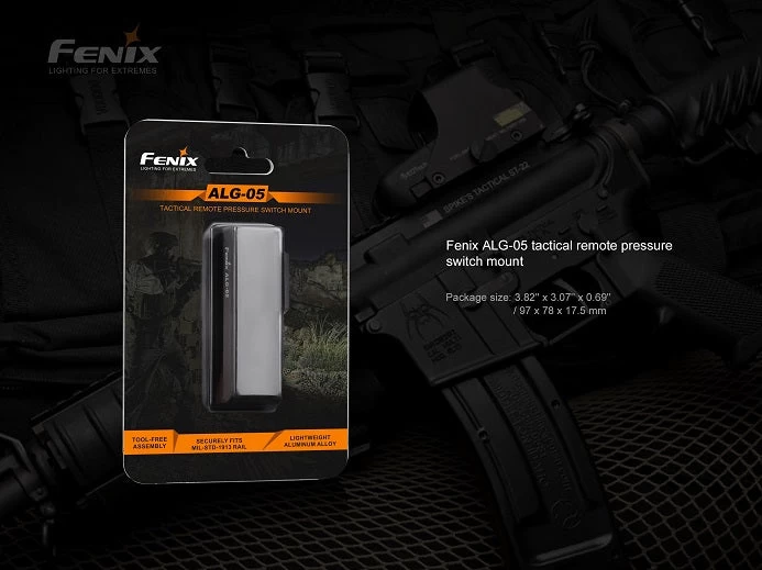 Fenix ALG-05 tactical remote pressure switch mount is specially designed for the newer Fenix AER series tactical remote switches. It attaches to a Picatinny rail by a simple push of the quick release, making for quick and tool free assembly and disassembly.