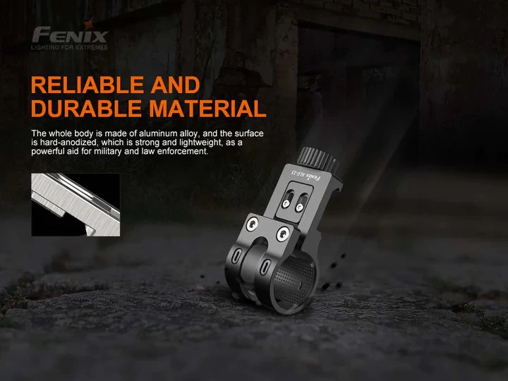 The Fenix ALG-15 Flashlight Rail Mount is an excellent solution for mounting a flashlight to a rifle with a Picatinny rail. The quick-release roller allows you to mount a flashlight for a secure fit. Made of hard-anodized aluminum, this mount is strong and lightweight—perfect for harsh conditions where durability counts.
