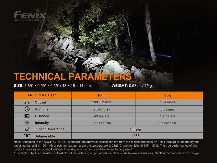 The Fenix E02R is a USB rechargeable mini keychain flashlight. This incredibly small flashlight is powered by a built-in rechargeable Li-polymer battery that delivers a maximum of 200 lumens and throws a beam up to 49m. A reliable twisty head activates the two brightness levels; twist the head to access the Micro USB charging port. Made of quality aluminum and completely dustproof and waterproof, this keychain flashlight is perfect for everyday carry.