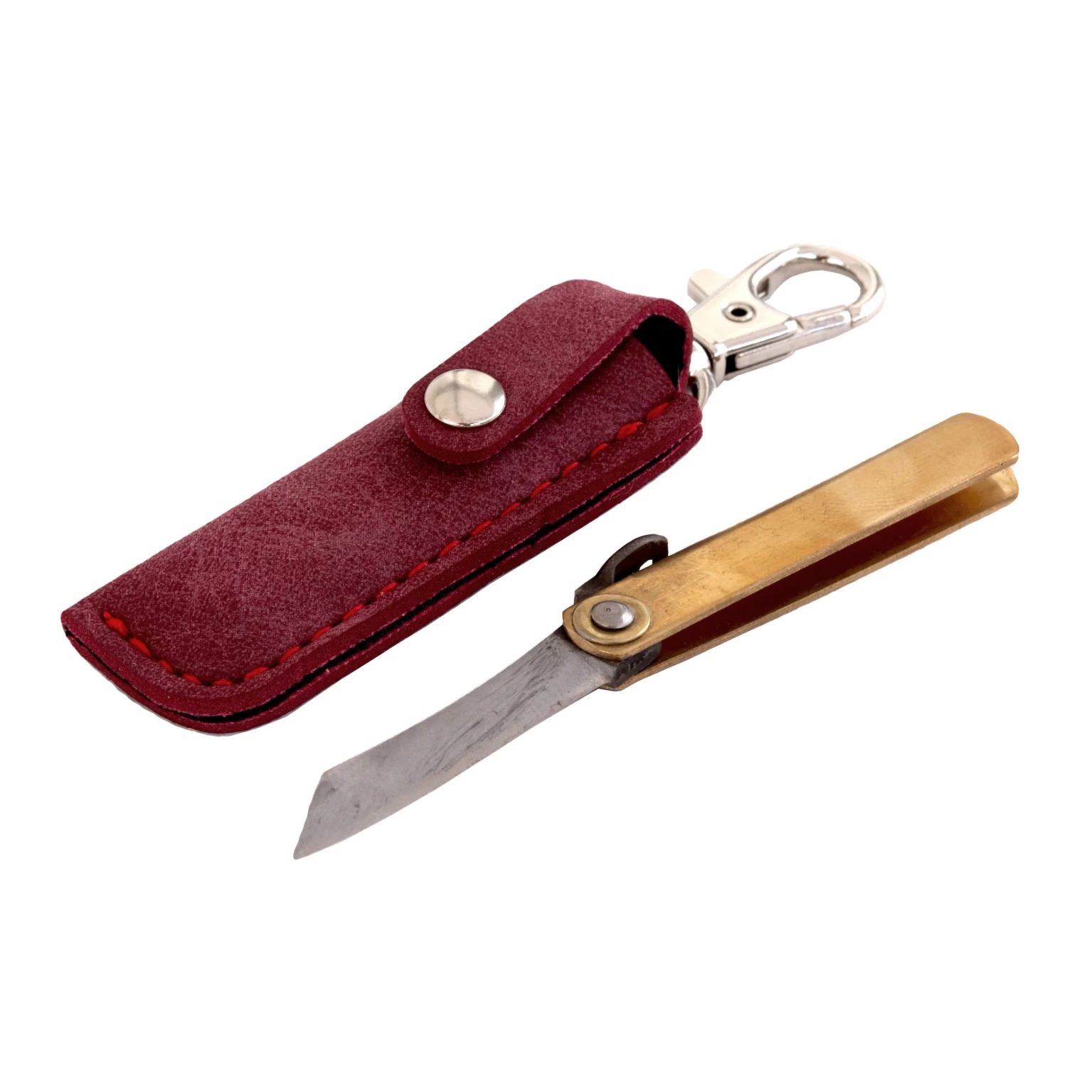 Traditional pocket knife Higo no Kami great for opening packages, feed bags, soil bags, sharpening pencils, whittling, cutting fruit and more. Laminated white steel in brass casing, with a case that can be used on a keychain.