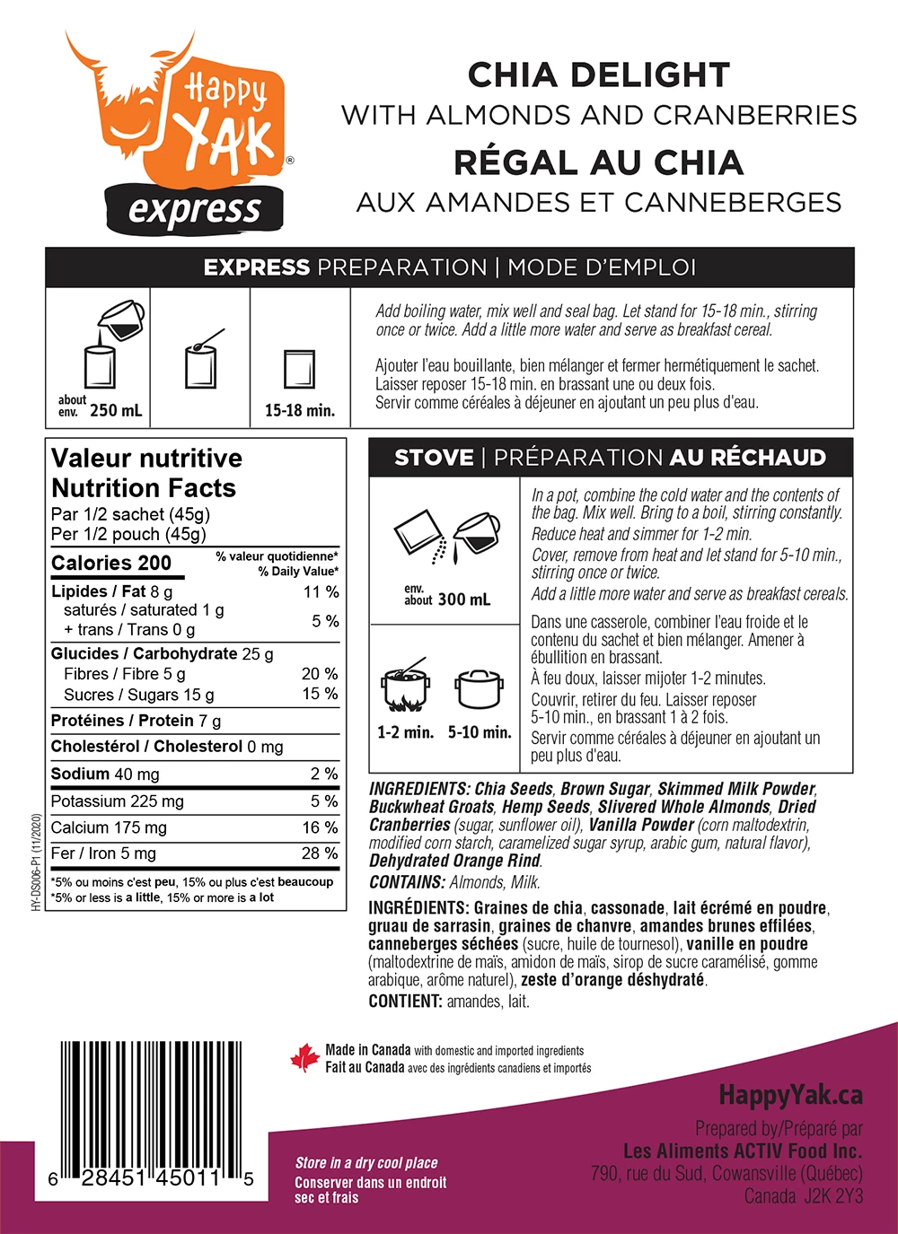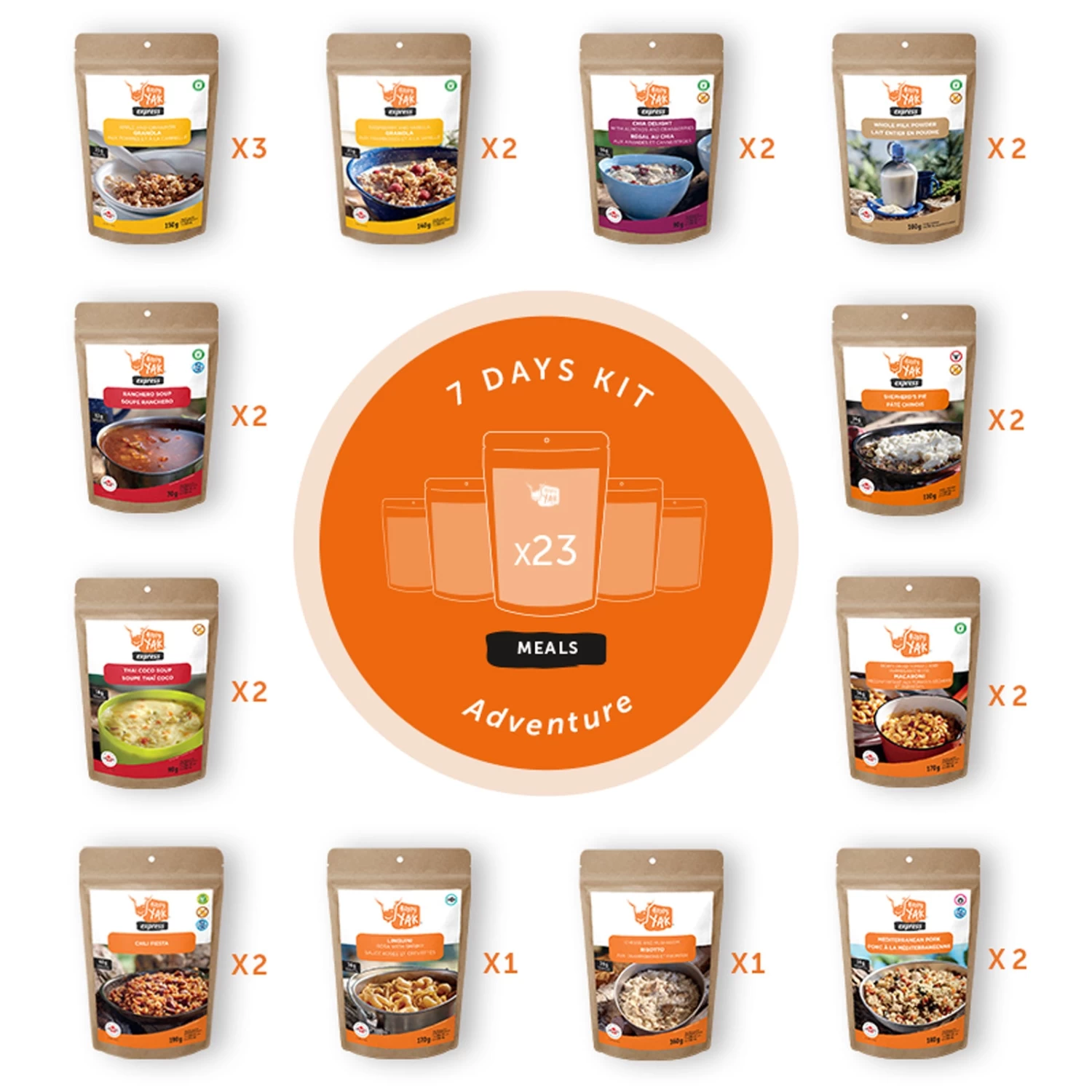 The ultimate kit for a short expedition or as a backup supply! The 7 Days Kit contains a variety of meals including breakfasts, soups and meals. Bonus: Two bags of whole milk powder for your cereal or your best homemade recipes! High in protein with a total of 619g and 12,300 calories, the 7 Days Kit – Adventure will give you the energy you need. Enough to fuel you no matter what the situation!
