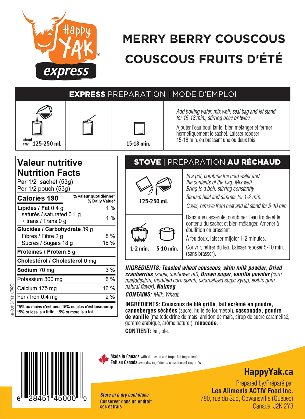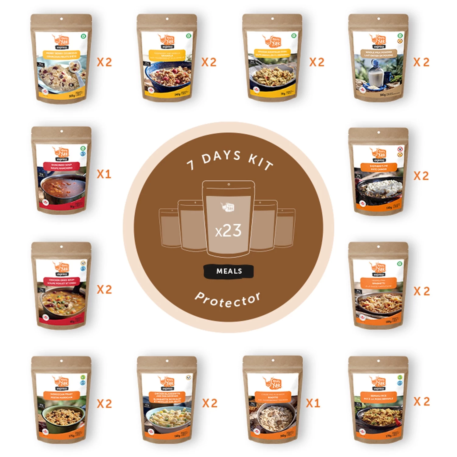 The ultimate kit for a short expedition or as a backup supply! The 7 Days Kit contains a variety of meals including breakfasts, soups and meals. Bonus: Two bags of whole milk powder for your cereal or your best homemade recipes! High in protein with a total of 623g and 11,980 calories, the 7 Days Kit – Protector will give you the energy you need. Enough to fuel you no matter what the situation!