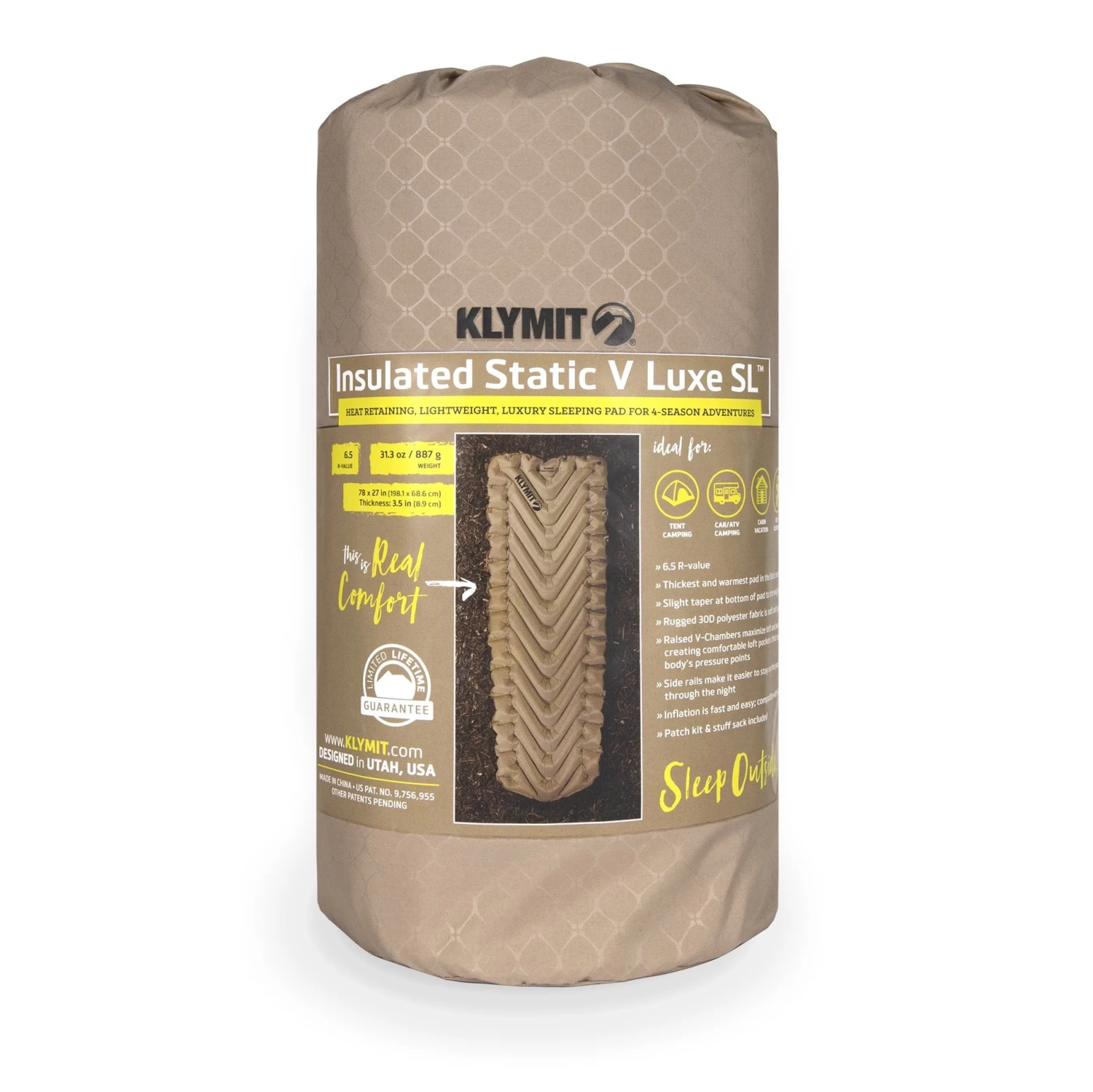 The Insulated Static V Luxe SL is an insulated, lightweight, luxury sleeping pad. The sleeping pad is the thickest and warmest pad in the Static Series line at 3.5 inches and a R-Value of 6.5. It’s the perfect balance of weight, width, and length in a luxury size. Slightly slimmer than the Insulated Static V Luxe, weight is trimmed by using a lightweight fabric and a slight taper at the bottom third of the pad. The exclusive V-chamber design conforms to the shape of your body while maintaining ample, lofted air pockets. The result: side, back, and stomach sleepers can all rest comfortably on a generous bed of air.