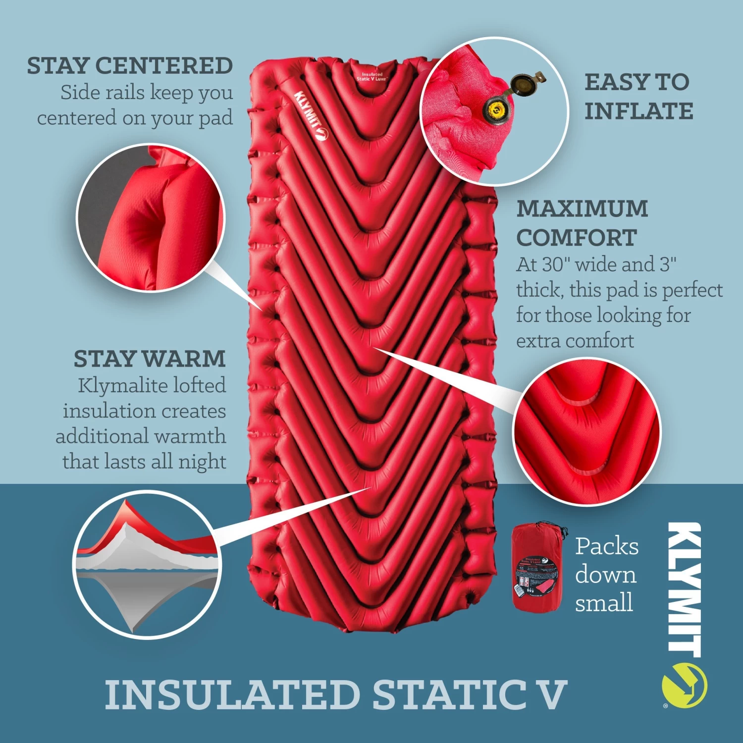 - Klymalite Synthetic insulation: Lightweight, compressible and durable, advanced synthetic insulation in the chambers slows the transfer of air between the top and bottom halves of the pad for improved thermal performance.