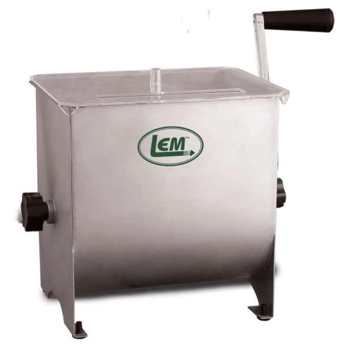 Large batches, small batches, or any size in between, we have the perfect size meat mixer for you. LEM Stainless Steel Meat Mixers make sausage making simple! Put the seasonings, water and meat into the hopper, turn the handle, and voila: a meat mixture in just minutes. Hopper and four mixing paddles are stainless steel, making them easy to clean and rust resistant. Includes clear, acrylic PMMa cover. This 20lb mixer tub measures 11in L by 10.25in W by 13in H.