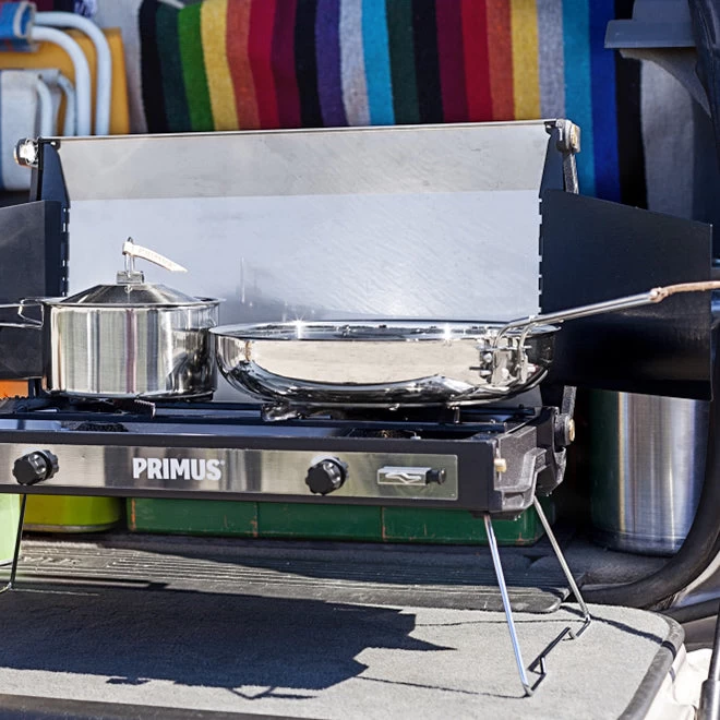 Durable 18/8 stainless steel Primus cookset – a genuine workhorse designed to withstand years and years of service. The set consists of two pots (1.0 and 1.8 L), two lids with integrated colanders and a frying pan. The frying pan has a foldaway handle and aluminum-clad bottom for even heat distribution. The pots are stackable and pack compactly together with the frying pan into an included storage bag.