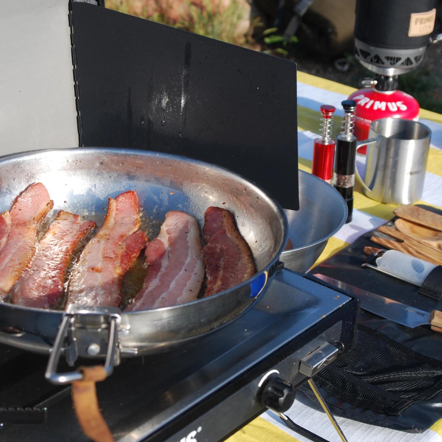 Durable frying pan in 18/8 stainless steel with aluminum clad bottom for even heat distribution. The pans can be placed directly on open fire, and they offer a very compact pack size thanks to the foldaway stainless steel handle. Comes with a storage bag.