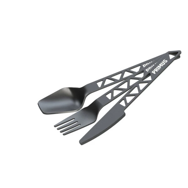 Fork, knife and spoon in high-grade, hard-anodized aluminum. Low weight and excellent durability. This set is dishwasher safe for easy cleaning when you get off the trail.