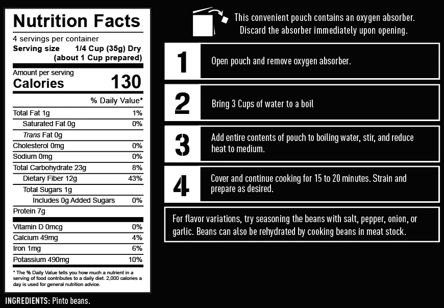 - Add entire contents pouch of dehydrated beans, stir and reduce heat to a simmer