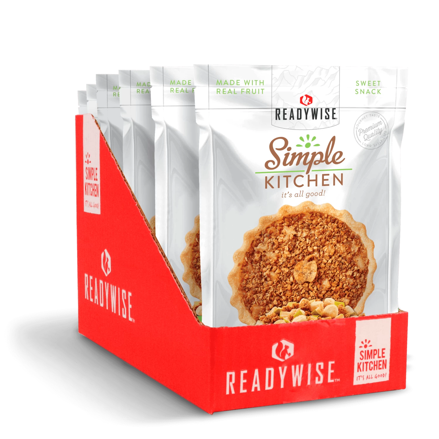This box includes six pouches of Simple Kitchen’s (a ReadyWise Company brand) Old Fashioned Apple Crisp.