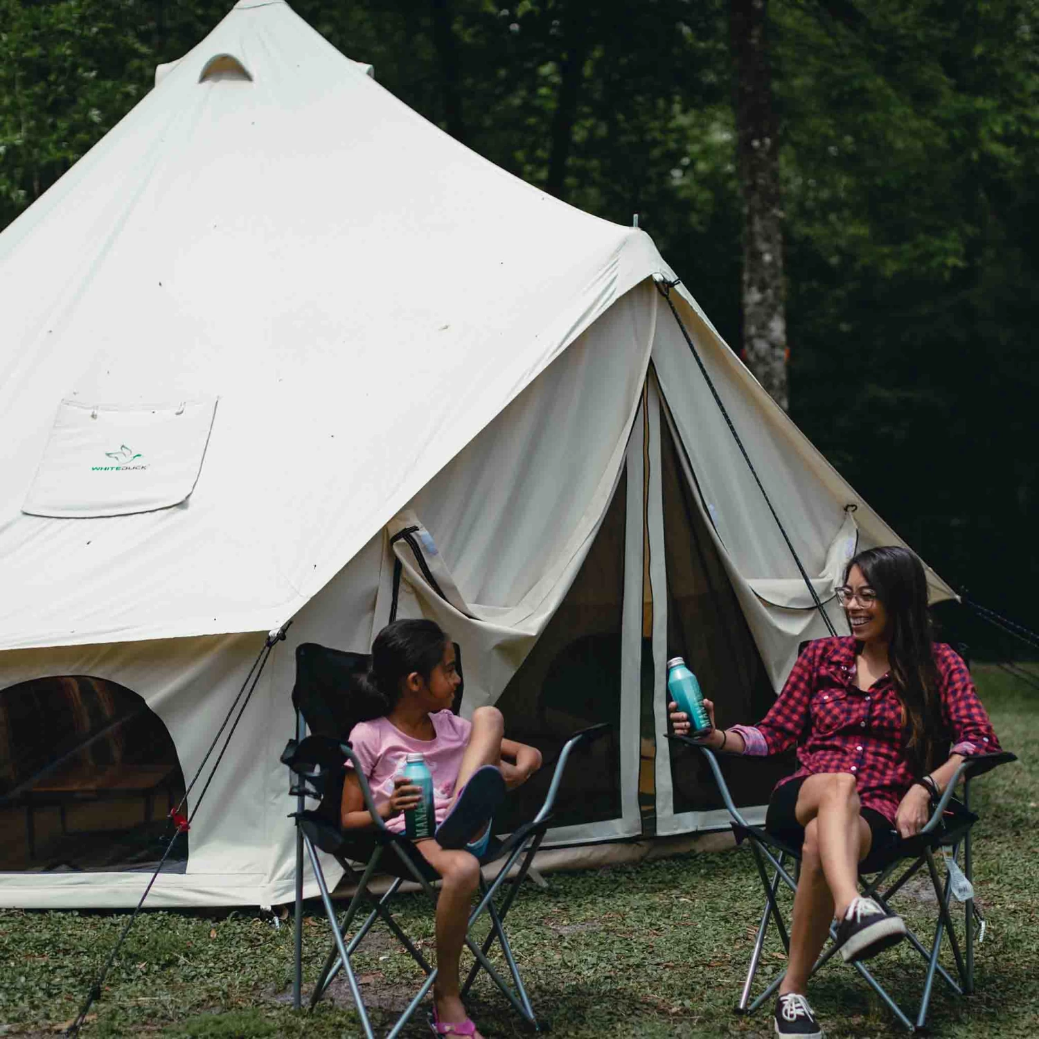 All canvas tents from White Duck Outdoors are treated with a proprietary breathable, PFC-free finish to make the tent water-repellent, mould and UV-resistant. Our bell tents are also available with a flame-retardant fabric option. The Fire Water Repellent (FWR) option is very popular with customers who want a stove inside the tent.